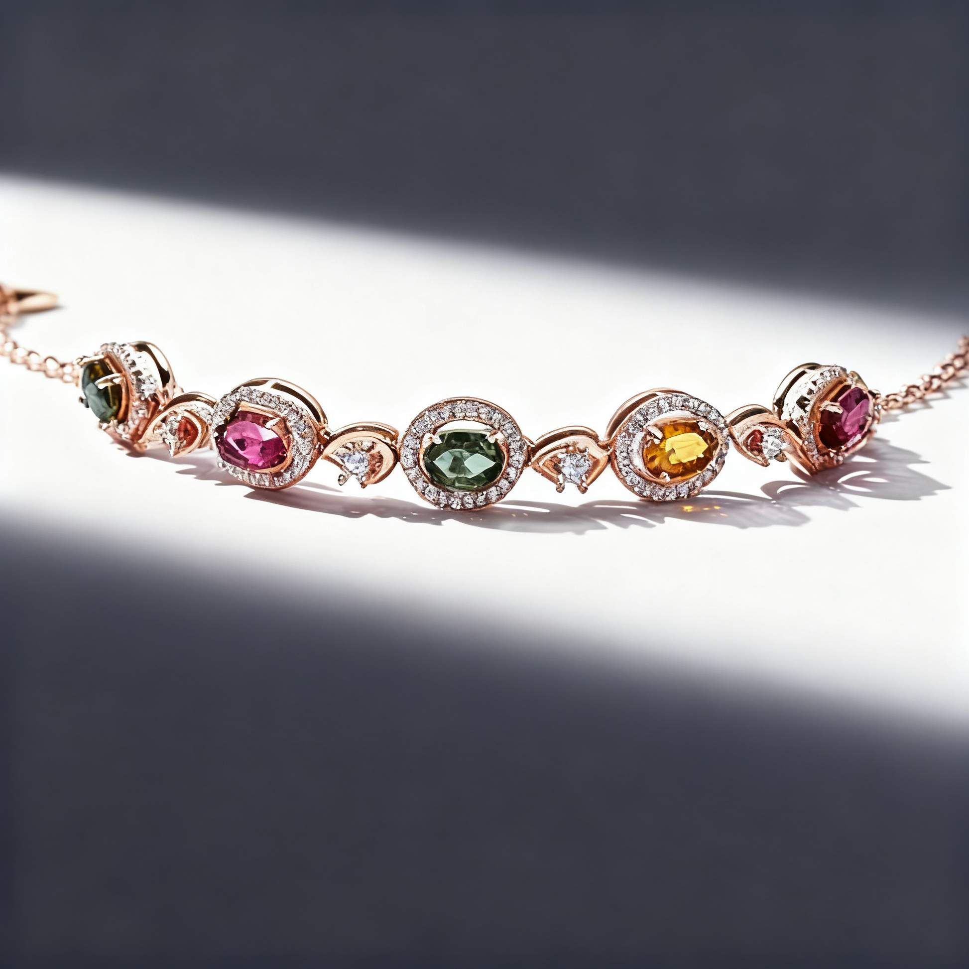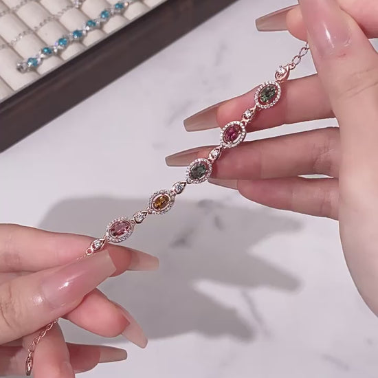 Every tourmaline centerpiece is encircled by a halo of sparkling accent stones, creating a star-like brilliance that complements the warm rose gold base. This design elevates the bracelet from a simple accessory to a statement of refined luxury, with rich color layers that feel both opulent and approachable. The adjustable chain ensures a perfect fit for any wrist, sitting comfortably against the skin for all-day wear without sacrificing style.